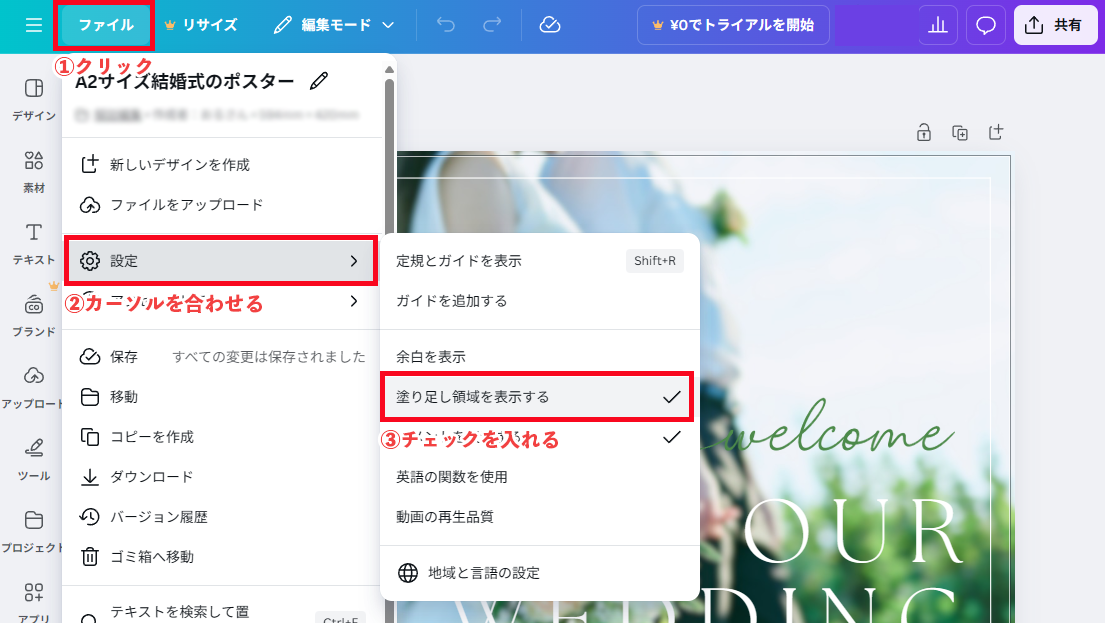 [ファイル]の中にある[設定]にカーソルを合わせると[塗り足し領域を表示する]項目があります。こちらにチェックを入れると、塗り足しの領域を確認しながらデザインができます。