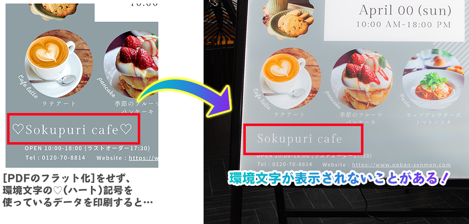環境依存文字(機種依存文字)や絵文字、文字として入力した記号(一例として♡●▶🔳など)は正しく印刷されない恐れがあり、印刷トラブルの元になる恐れがあるため、使わないようにしましょう。どうしても使う必要がある場合は、後に述べますがデータをダウンロードする際にPDFフラット化をしてください。