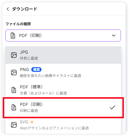 JPG、PNG、PDF(標準)、PDF(印刷)など様々なファイルの種類があります。その中から、 [PDF(印刷)] を選択してください。