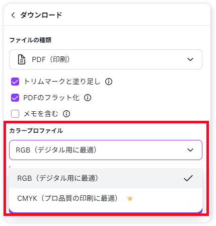有料プランの方は、[RGB]と[CMYK]のどちらかを設定することが可能なので、任意のカラープロファイルを選択してください。